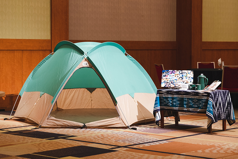 ウェイティングルームにテントを張り、小さなお子さまも床に座ってのびのびと過ごせるようにと、お子さま連れのゲストへのご配慮も忘れないおふたりでいらっしゃいました。