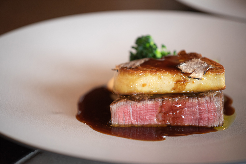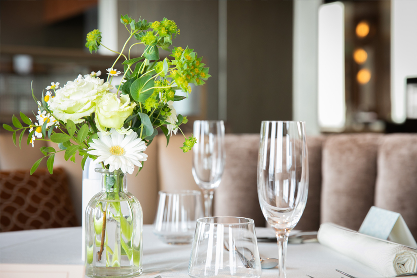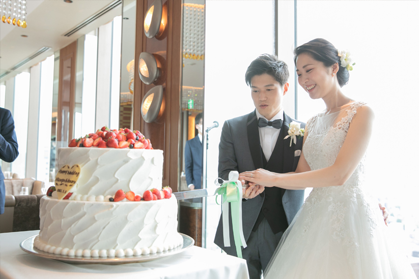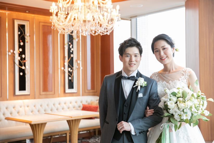 おふたりがパーティー会場に選ばれたのは、ホテルの39階に位置するレストラン「TABLE 9 TOKYO」のダイニング「GRILL & STEAK」。ゴールドを基調としたクラシックモダンな会場で、大きな窓からは壮大な景色が臨めます。お天気が良かったこの日は、横浜のみなとみらい地区まで見えていました。