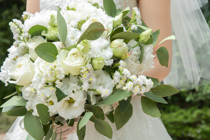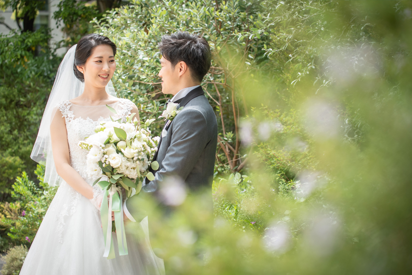 緑溢れるガーデンにおふたりの姿が爽やかに映え、またホワイトを基調にしたご新婦さまのクラッチブーケがおふたりに一層の華やかさを添えていました。