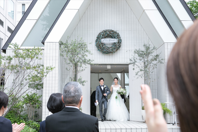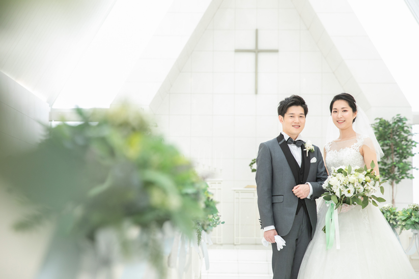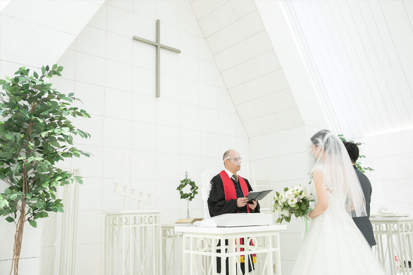 外観から内装まで、全てが真っ白な「ホワイトチャペル」。五月の日差しが柔らかく差し込むチャペルでご家族やご友人が見守るなか、おふたりの永遠の誓いが行われました。