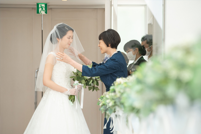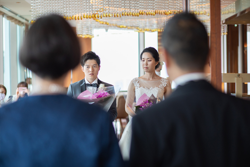これまで一緒に過ごした日々を思い返しながら親御さまに向かって一歩一歩踏みしめるように近づいていくおふたりに、会場は感動的な雰囲気に。