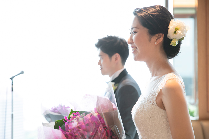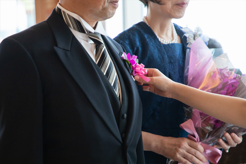 お父さまの胸ポケットにブートニアを差し、お母さまに花束を手渡して今までの感謝の気持ちを伝えると、ゲストから温かい拍手が沸き起こりました。