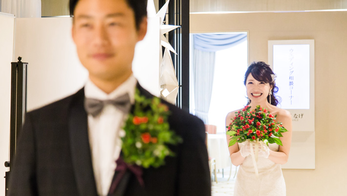 初めてウエディングドレス、タキシードに身を包む新郎新婦が出会う感動的な瞬間です。