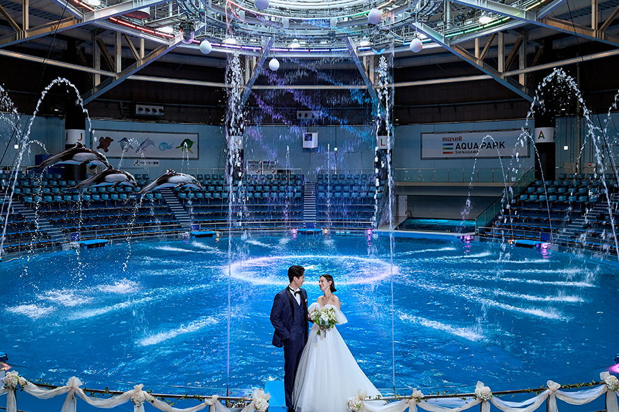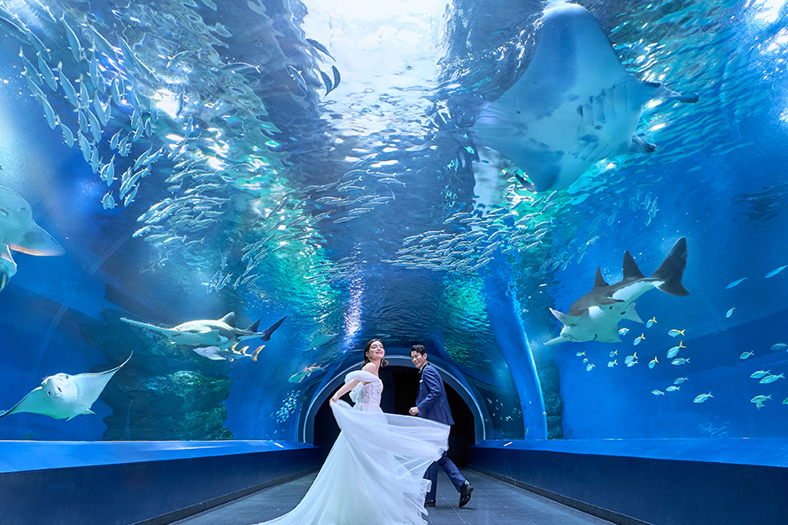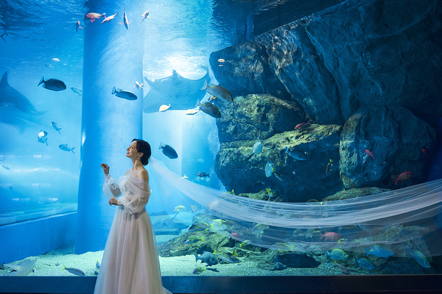 朝の水族館を貸し切って行う挙式「アクアマリン ウエディング」は幻想的な雰囲気を独占できます。