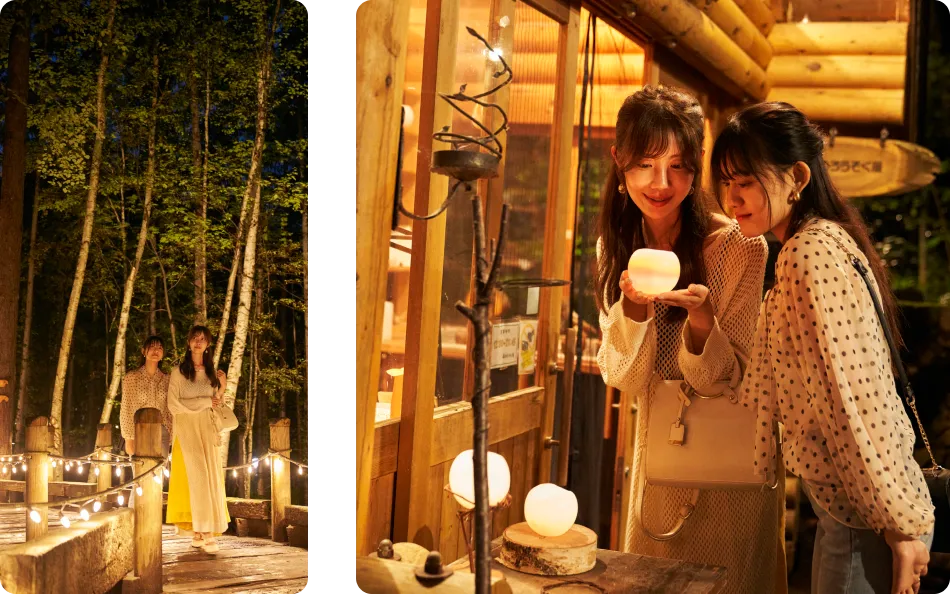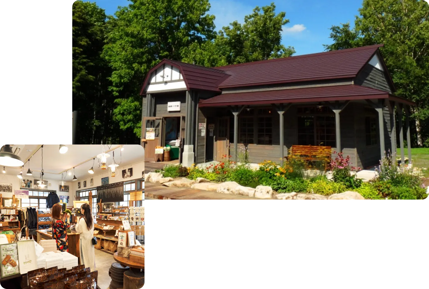 15棟に連なるログハウスでは、想いのこもった手作りの雑貨や小物が販売。お気に入りを見つけて旅の想い出に。