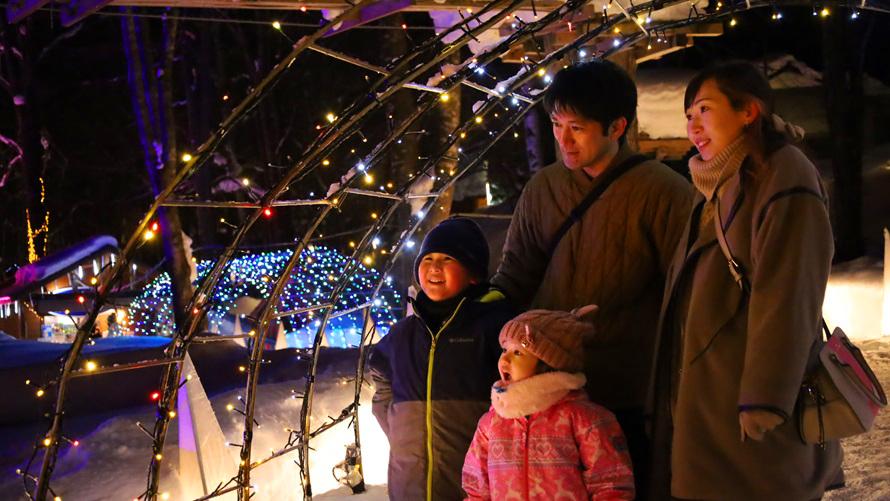 新富良野プリンスホテルに隣接し、約6万球のイルミネーションで鮮やかにライトアップされたナイトアクティビティエリアです。雪と氷でつくられたフォトスポットやスノーチュービング・犬ぞり体験などをお楽しみいただけます。