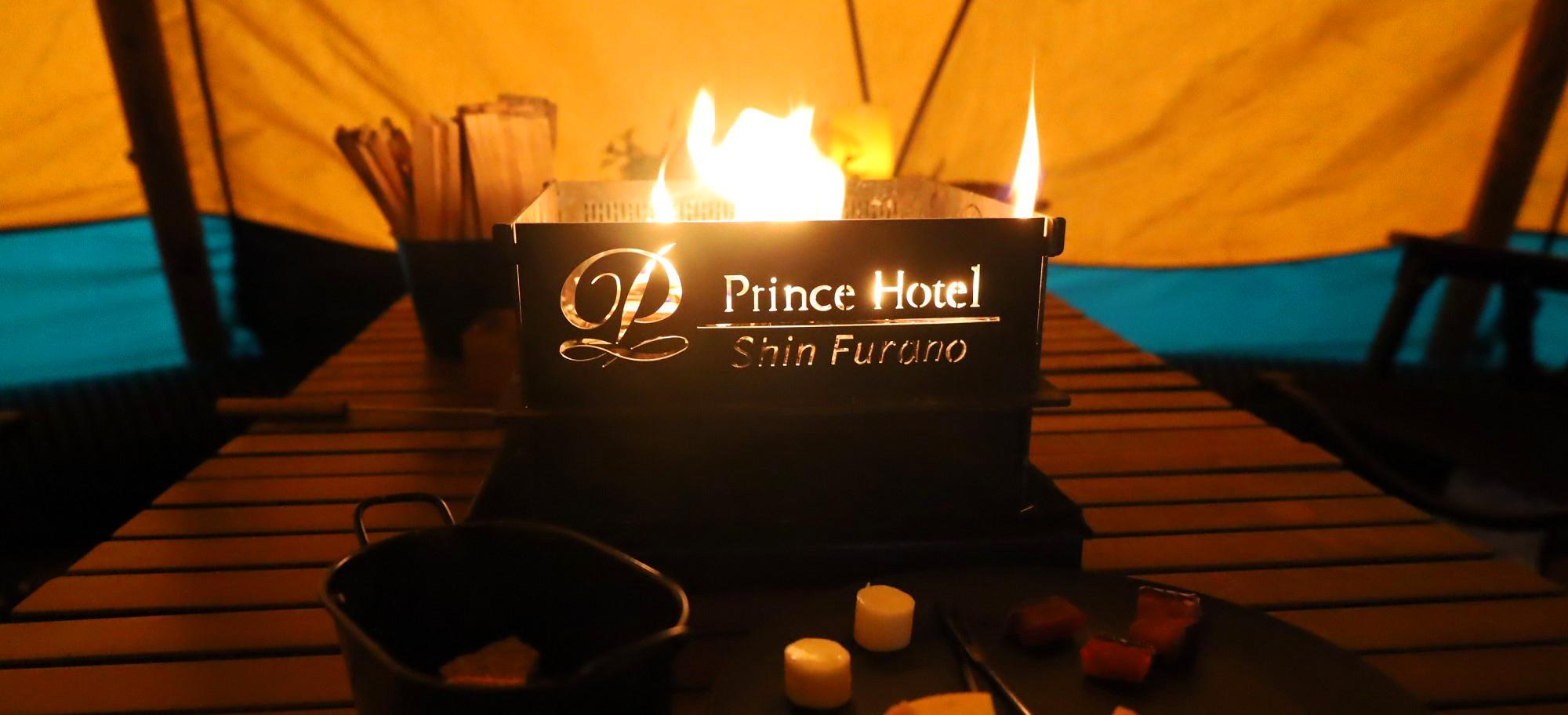 ホテル中庭の大型テント内ではテーブルに焚火台が置かれ、お酒を楽しみながらおつまみを炙ってお召しあがりいただきます。
