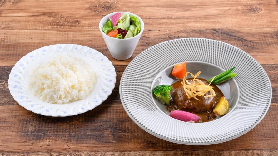 〇煮込みハンバーグステーキ【ふらの和牛、かみふらのポーク使用】(ライス、サラダ付き) \3,000