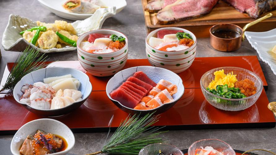 期間限定で、年末年始を感じるブッフェメニューをご提供いたします。国産牛のローストビーフや日替わりライブキッチンをお楽しみいただけます。お客さまご自身が新鮮な海の幸で造る「なまら勝手飯」など、さまざまな料理をご用意しております。年末年始のご滞在中はホテルならではのブッフェ料理を思う存分ご堪能ください。