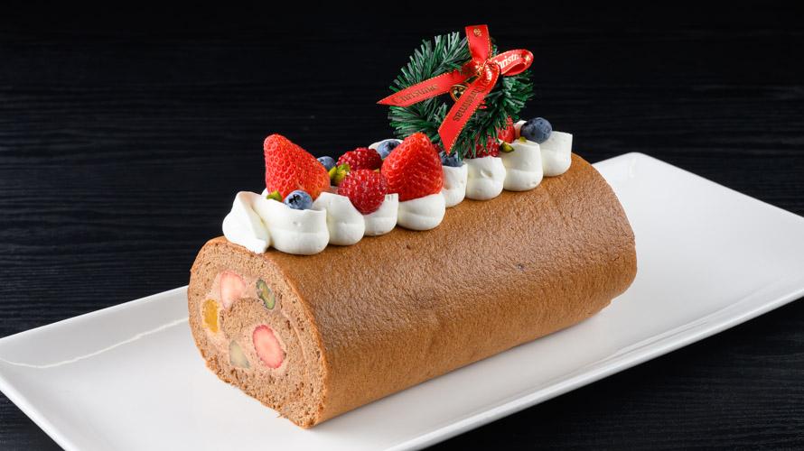 しっとりと焼き上げたココアスポンジでチョコ生クリームと苺、ラズベリーなどの色とりどりのフルーツを包み込みました。