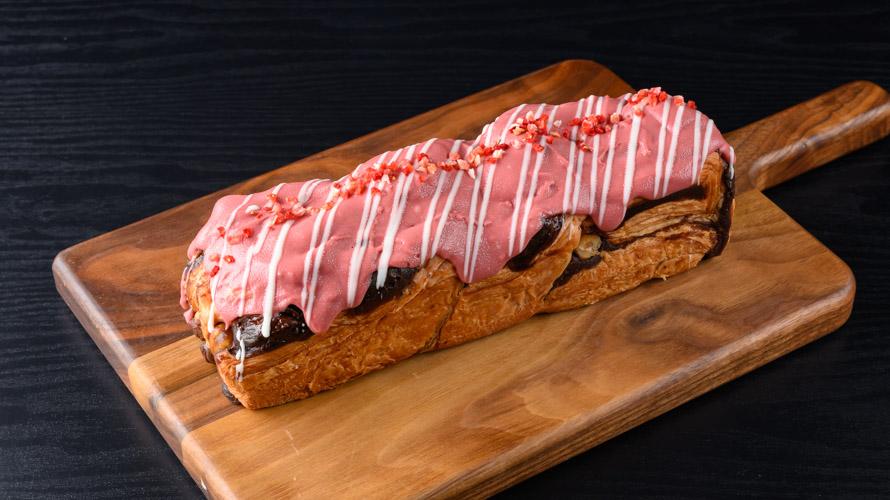 ニューヨークで流行したクロワッサン生地にイチゴ味のチョコレートやドライ苺、ナッツを練りこんだリッチな味わいの菓子パンです。