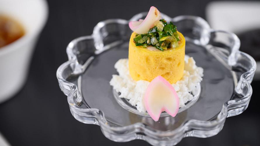 一口前菜《椒麻蟹肉捲》ズワイ蟹のタマゴ捲き山椒ソース乗せ