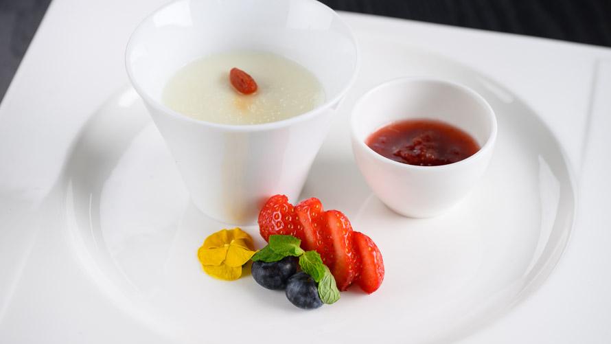 ≪杏仁凍布甸≫ 濃厚杏仁プリン 富良野産苺ソース掛け