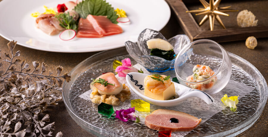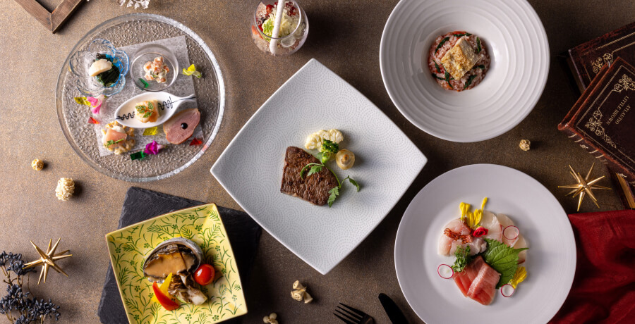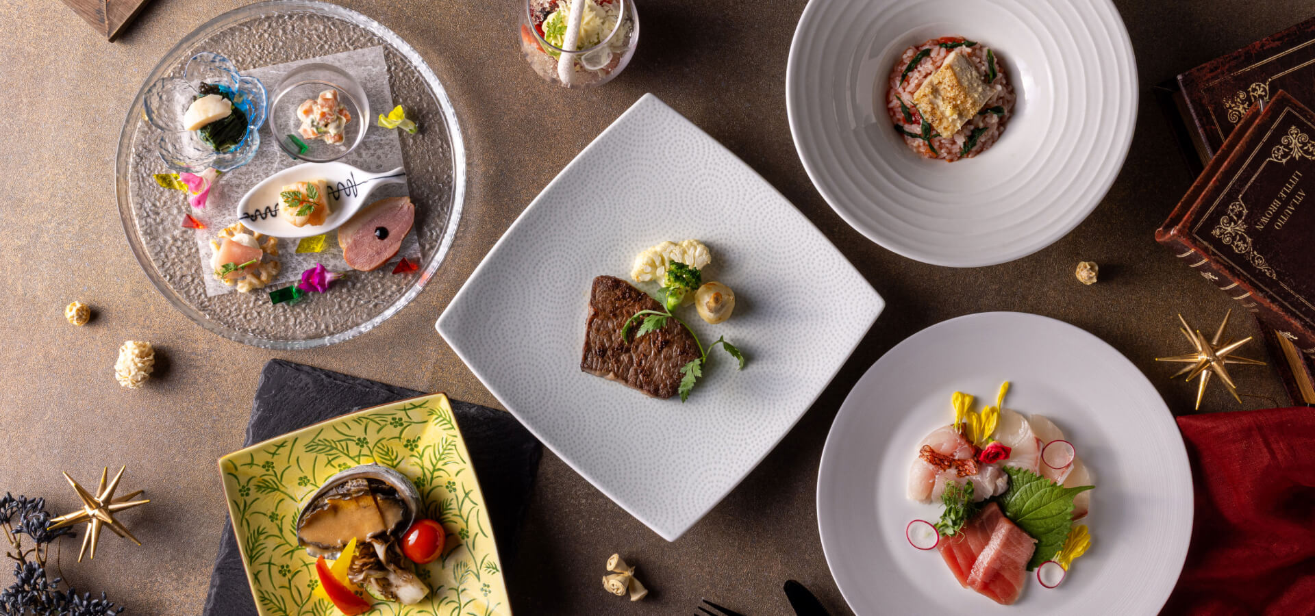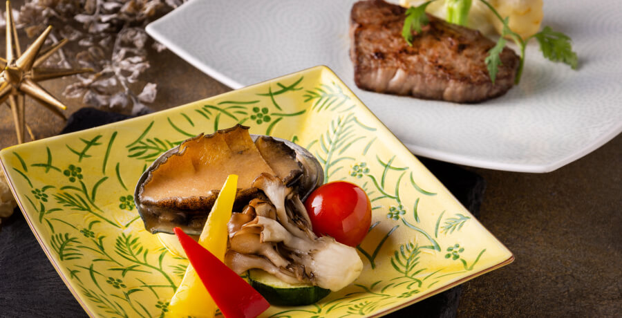 帆立貝やキャビア、鮑のバター醤油焼き、国産牛サーロインなど、五感で楽しむ一皿一皿が特別なひとときを華やかに彩ります。