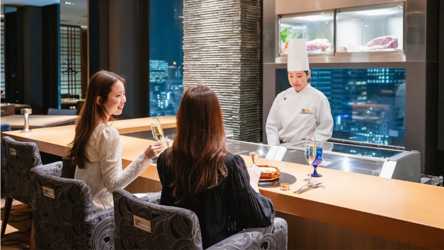西新宿の高層ビル群の景色を眺めることができるカウンターでは、和牛の鉄板焼きコースをお楽しみいただけます。