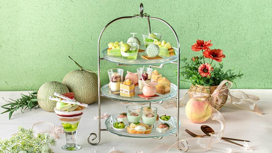 柔らかなピンクとみずみずしいグリーン。可憐な果実が織りなす、やさしく甘い世界に包まれるアフタヌーンティー。