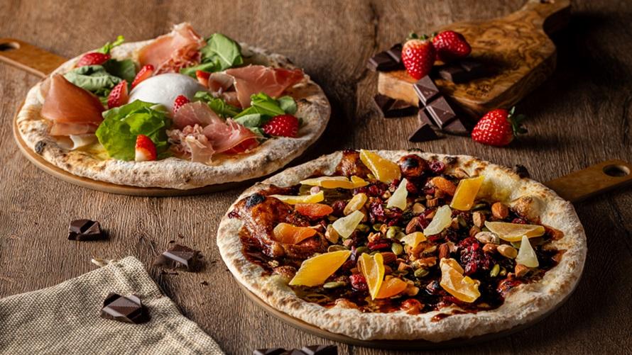 甘さを抑えたビターショコラに、ナッツの香ばしさとドライフルーツの自然な甘みを重ねたピザや苺とブッラータチーズに、バルサミコ酢のアクセントを加えたピザをご用意いたしました。