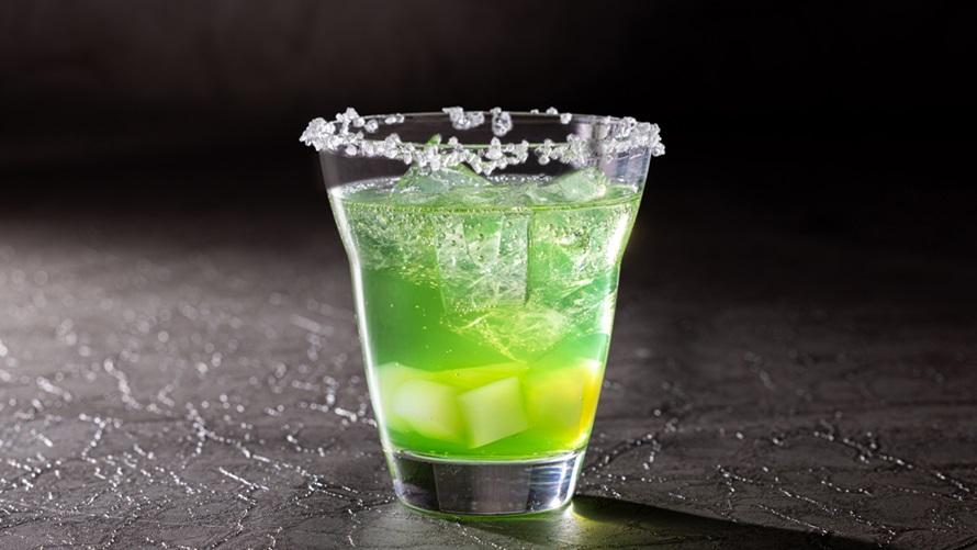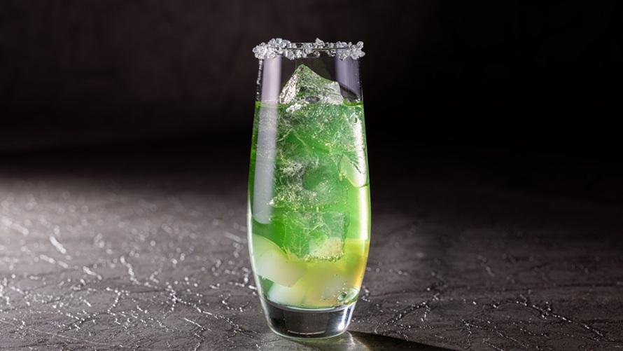 【カクテル】ラム、グリーンアップルシロップ、ナタデココ、ノンアルコールワイン(白)、ソーダ、マルガリータソルト