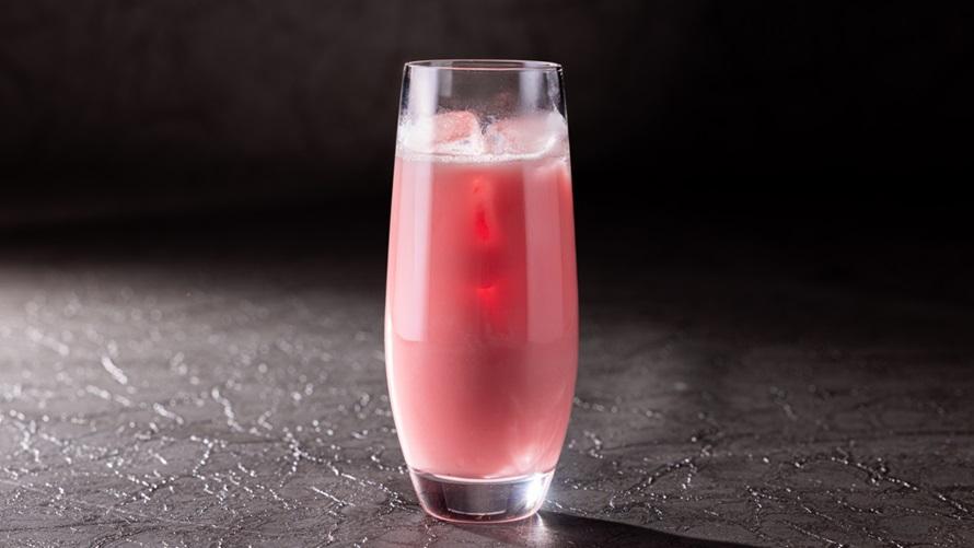 【カクテル】ヨーグルトリキュール、ヨーグルトドリンク、白桃ジュース、ローズシロップ+グレナデンシロップ