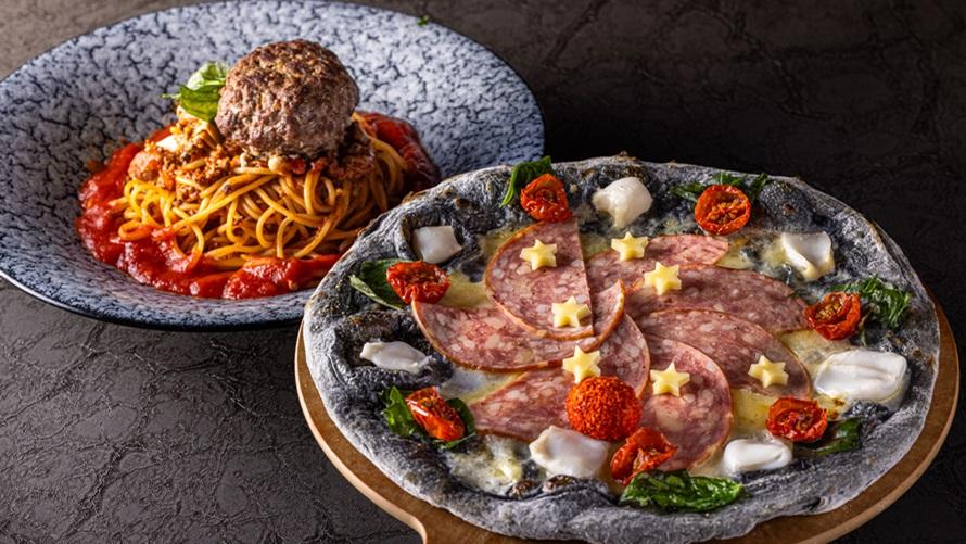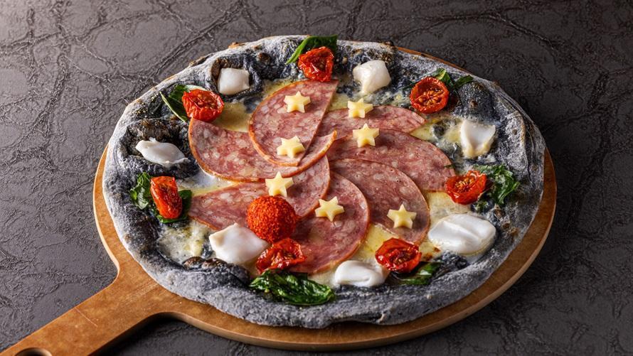 夜空に浮かぶ北斗七星をイメージしたピザ。イカスミを練り込んだ生地で夜空を表現し、北斗七星を思わせる盛り付けで仕上げました。静かに輝く“死兆星” としてハバネロチーズボールをトッピング。食べるか、逃げるかあなた次第。