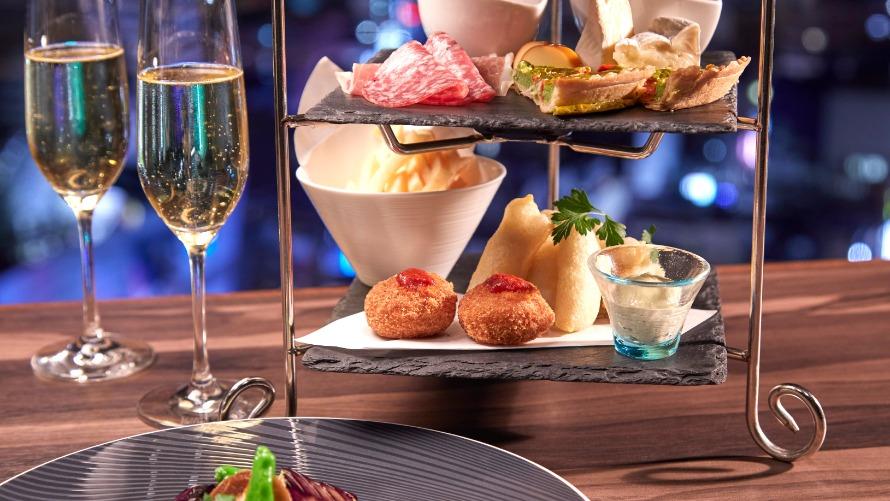 ホテル最上階からの景色を望みながら、国産牛のステーキや一口寿司など、お食事をメインにスタンドで提供する「イブニングハイティー」が登場!