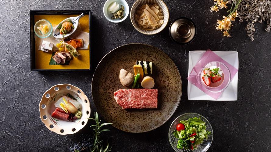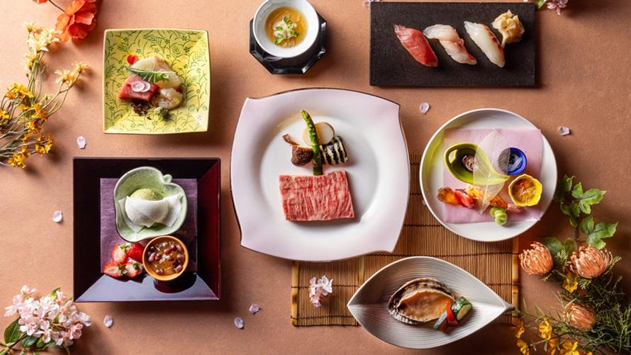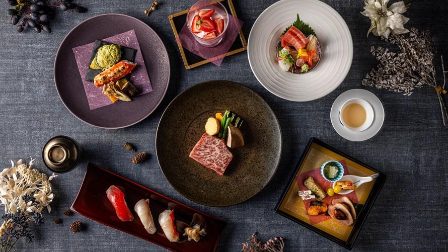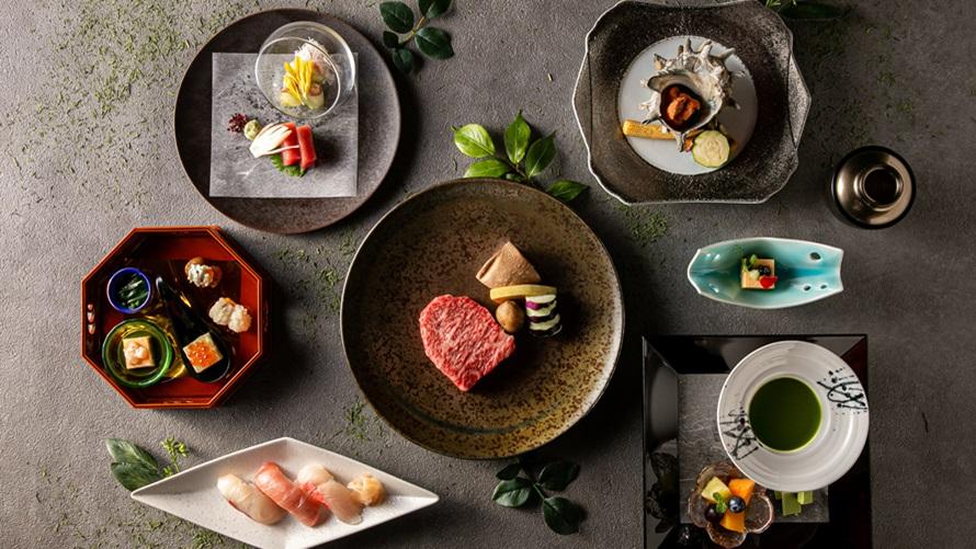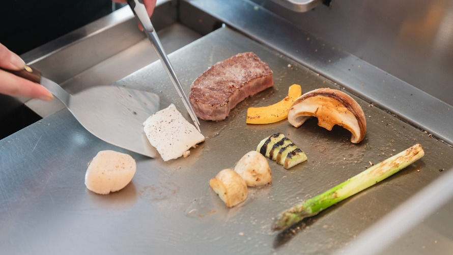 和牛・魚介類・旬の野菜それぞれの素材の持ち味を活かし、シェフが目の前で丁寧に焼き上げご提供いたします。更に、コースにはお好みで選べるお造りや目の前で握る寿司もご用意。