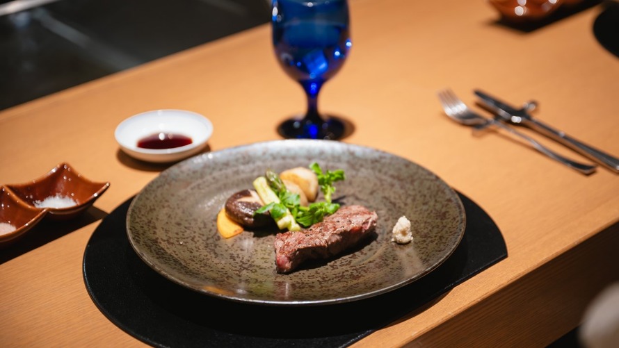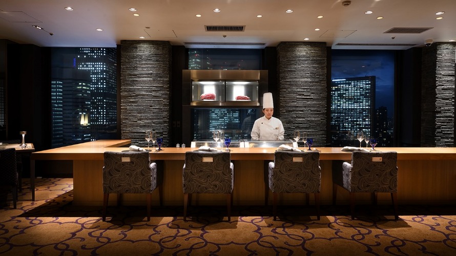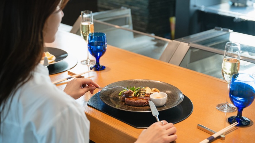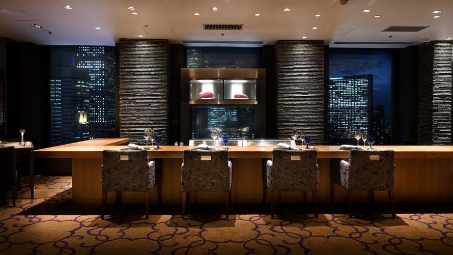 西新宿の高層ビル群の景色を眺めることができるカウンターでは、和牛の鉄板焼きコースをお楽しみいただけます。