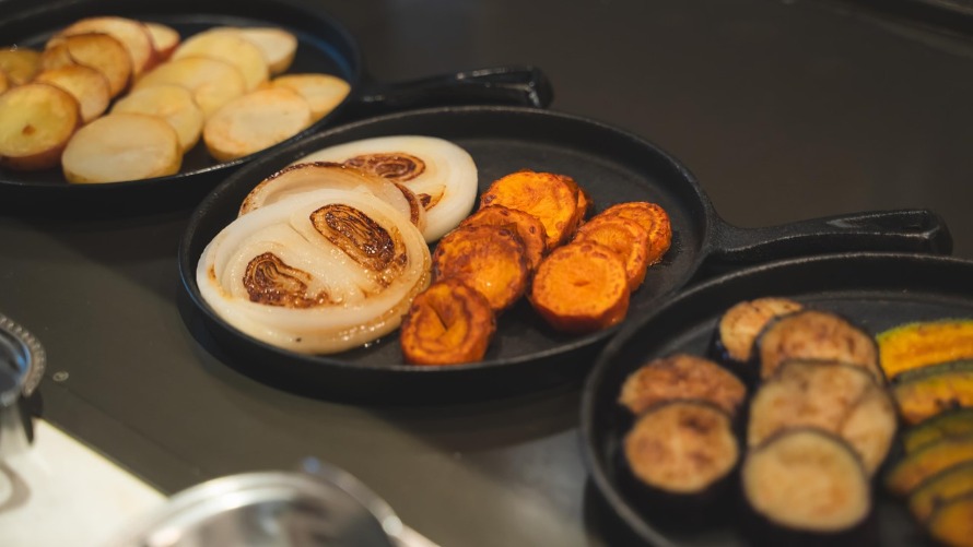 ライブキッチンでご提供する、季節の旬の野菜や仕入れ状況によって変化する野菜の鉄板焼き。