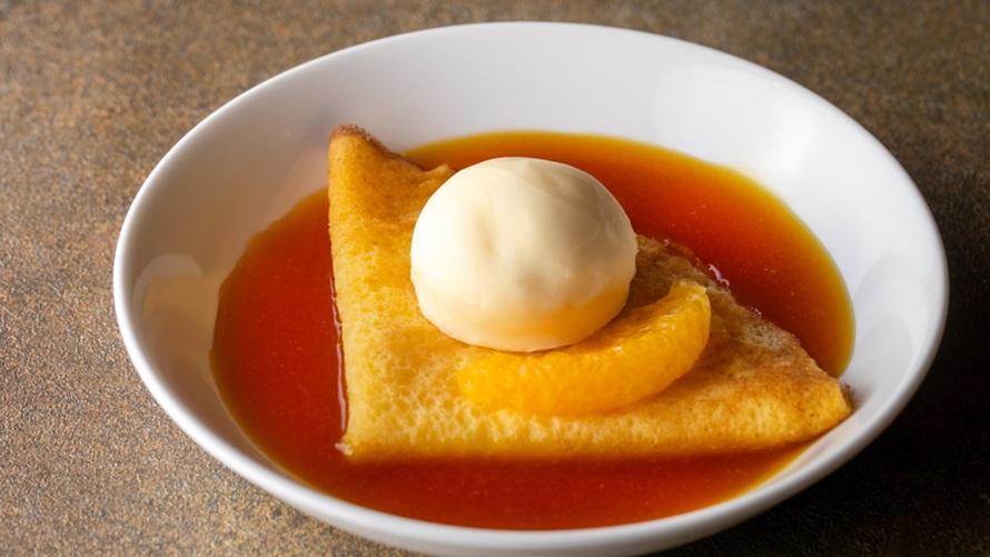薄く焼き上げたクレープにオレンジの風味豊かなソースを合わせました。華やかな香りが立ちのぼる、クラシカルなデザートです。