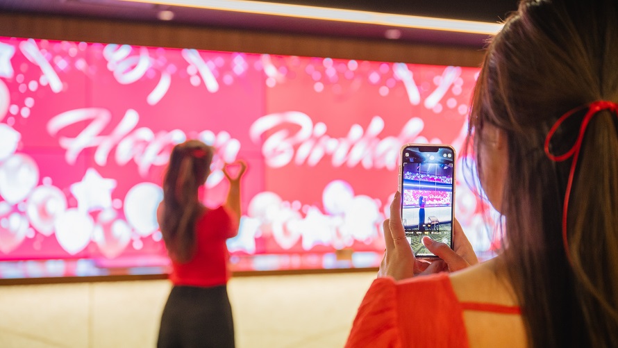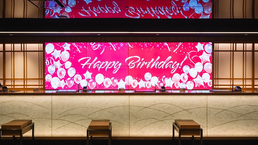フロントの大画面には、あなたと推しへのお祝いメッセージをお届け。聖夜の推し活を彩ります。