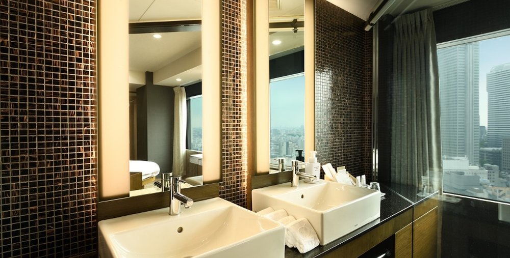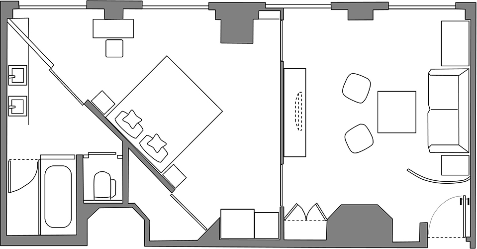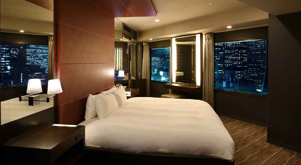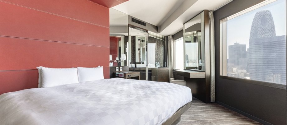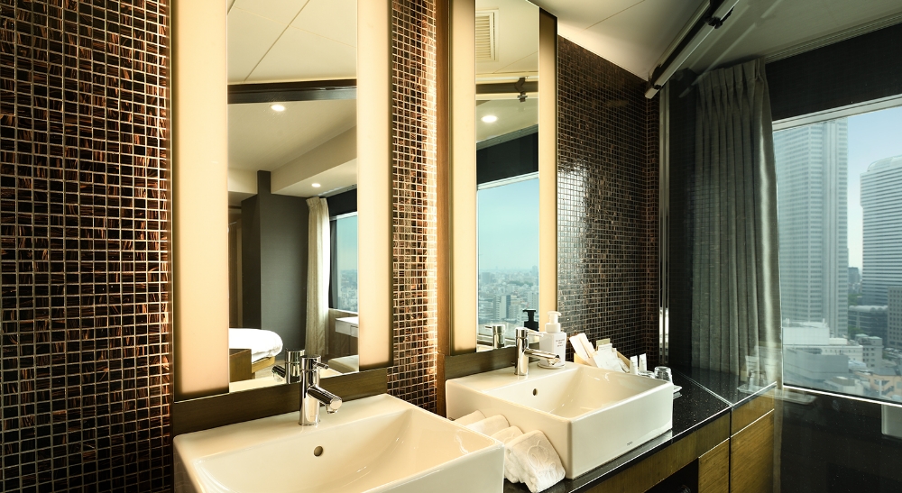 ベッドを斜めにした斬新なデザイン。バスルームからも外の眺望がご覧いただけます。