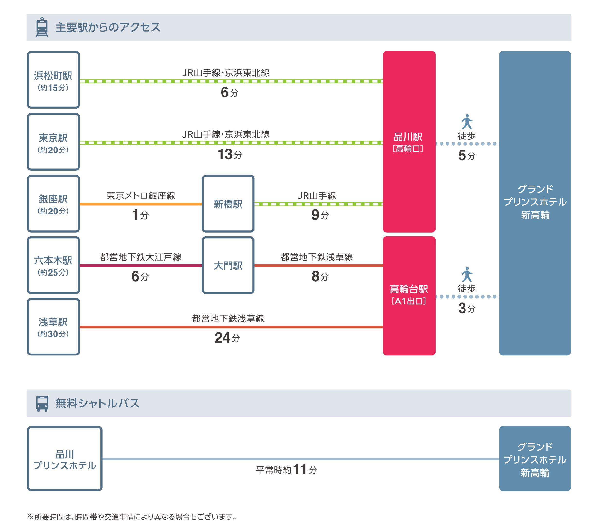 駅名 路線名 所要時間 品川駅 新幹線・JR線・京浜急行線 高輪口より徒歩約5分 第一京浜を渡り、柘榴坂を道なり(登り坂)約400m 高輪台駅 都営地下鉄浅草線 A1出口より徒歩約3分(ザ・プリンス さくらタワー東京は徒歩約5分) シャトルバスのご案内
