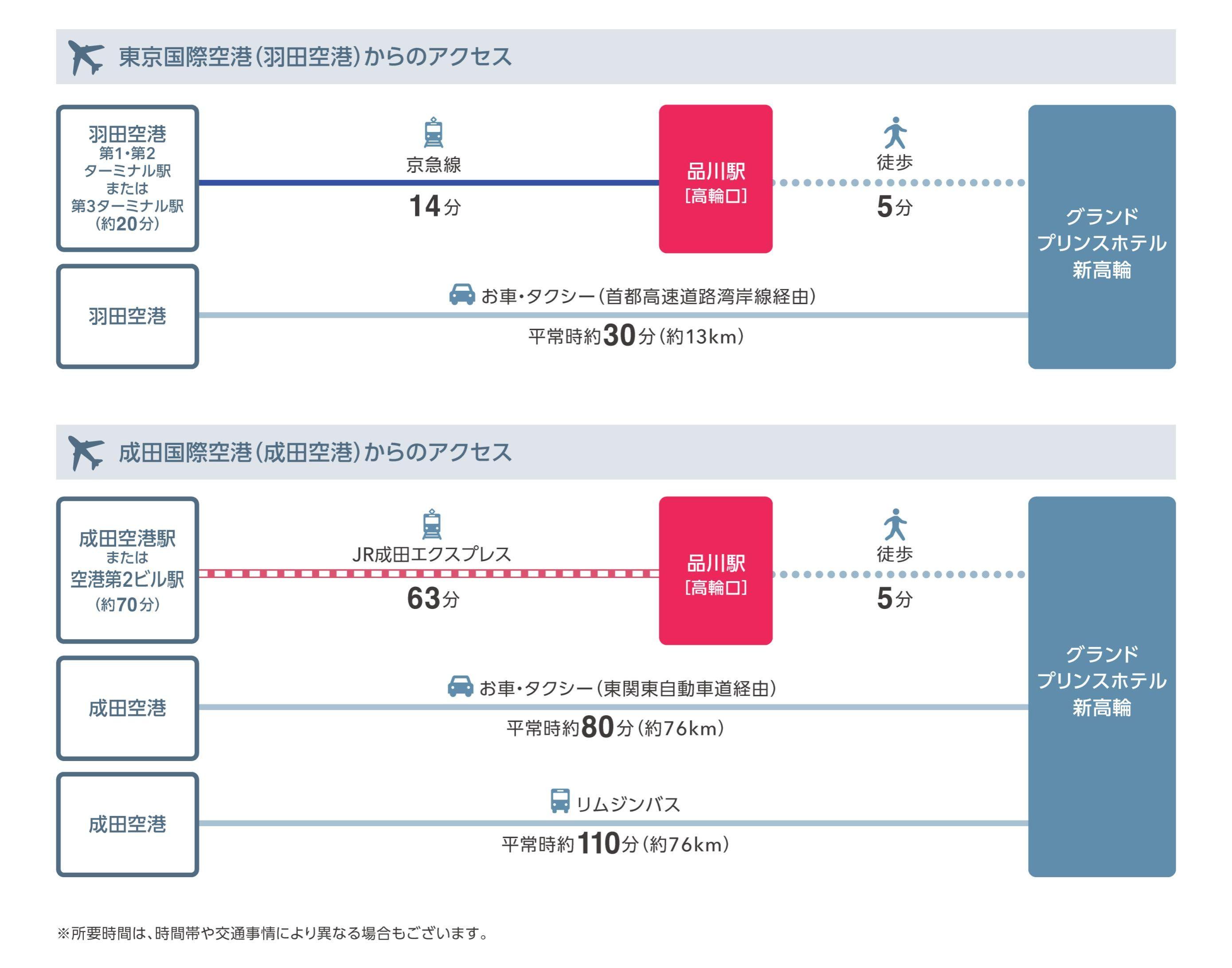 交通手段 経路 所要時間 電車 京急線(品川方面) 品川駅まで最速14分(駅下車 徒歩約5分) 車またはタクシー 首都高速経由 約30分 成田空港より