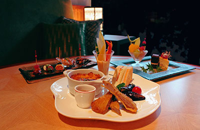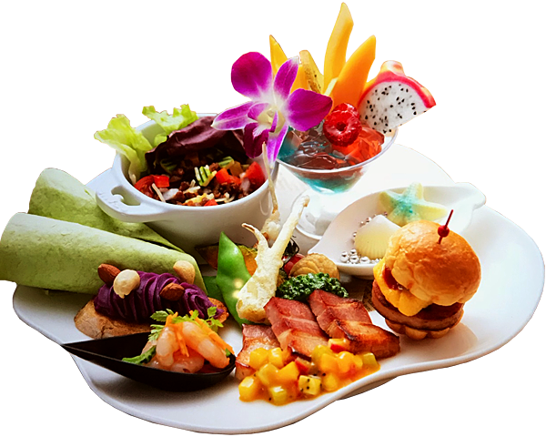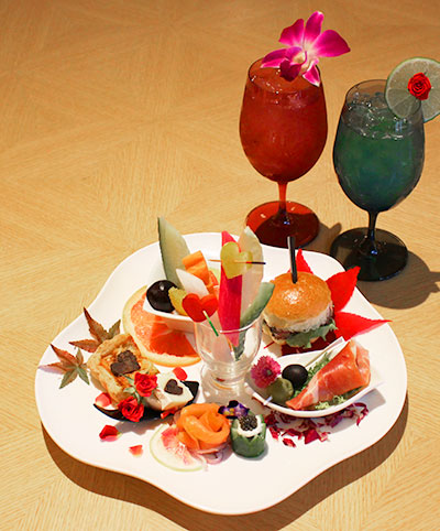 沖縄をイメージした料理の数々、南国フルーツと夏らしいスイーツを添えた一皿。
