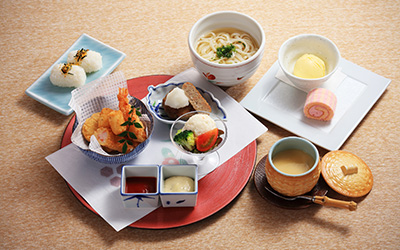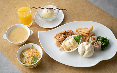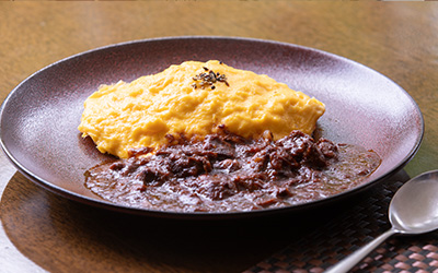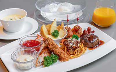 大きな窓の向こうに広がる日本庭園を眺めながら、オムライスやハンバーグなどのお料理をお楽しみいただけます。