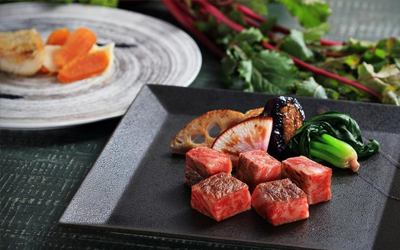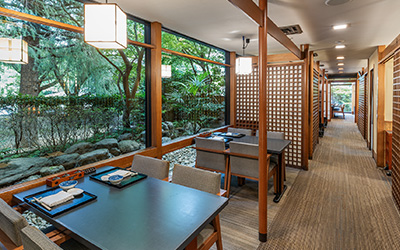 銘柄牛や山海の幸を、臨場感あふれる鉄板焼で味わえる、日本庭園内に佇むレストラン。