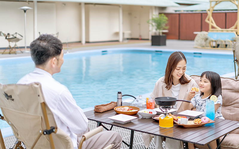 都心とは思えないほどの広い空を望むルーフトップのプールサイドで、新緑の風と炎のゆらぎに癒される特別な体験を。