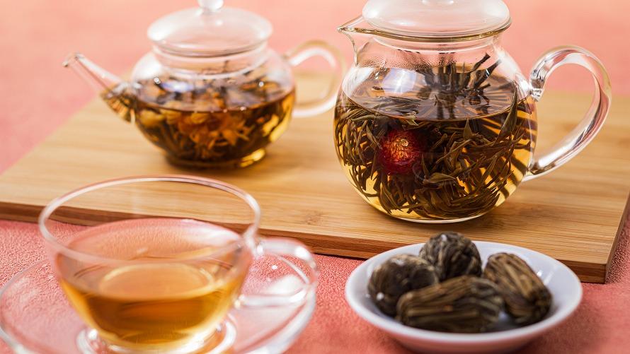 赤い千日紅の花と黄色い菊の花、白い玉胡蝶の花びらのコントラストが美しくぱっと開く、上品なジャスミン茶です。