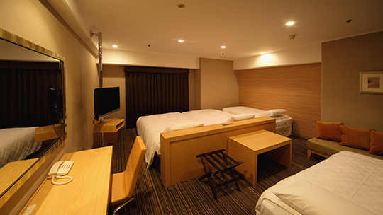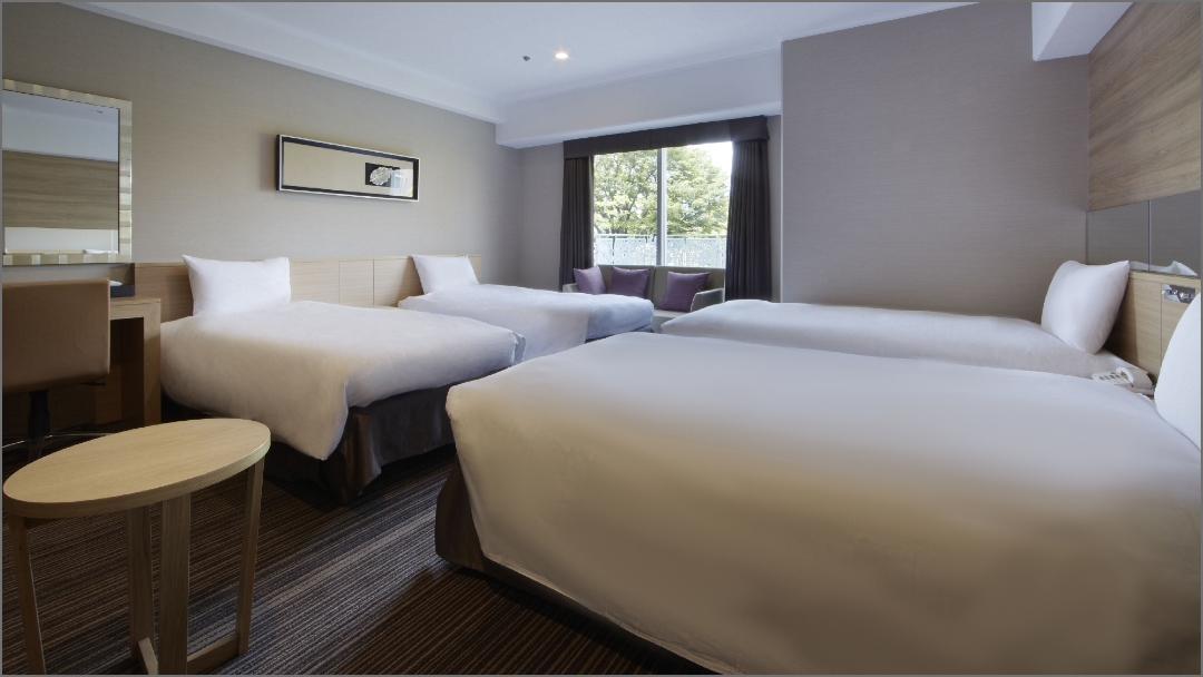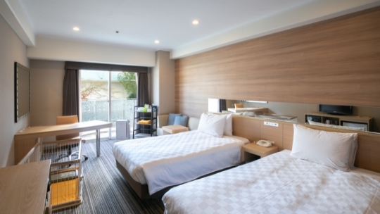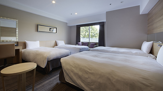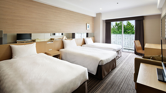 バルコニー付き3名さまでご利用できるお部屋で、ご家族や女子会などグループでの滞在におすすめです。客室全体は木目調の自然を意識したデザインに統一しております。
