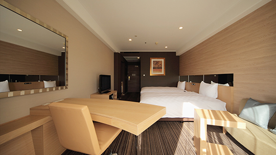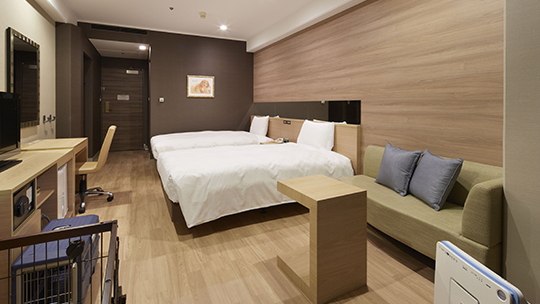 バルコニー付き客室全体を木目調の自然を意識したデザインに統一。家具などもコンパクト化し住居スペースを拡張することで快適な空間をご提供します。