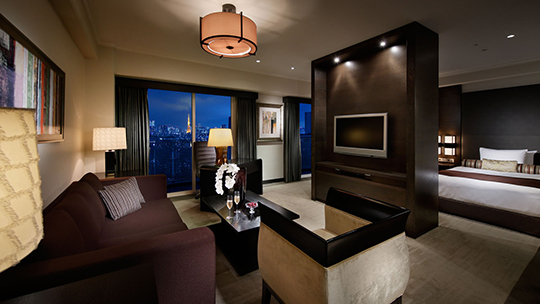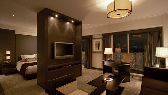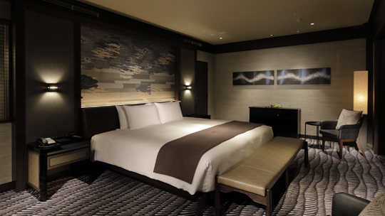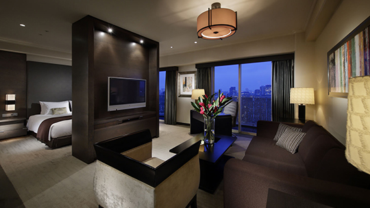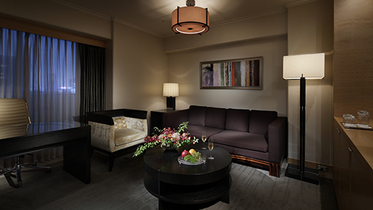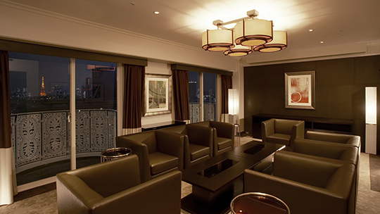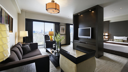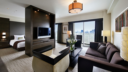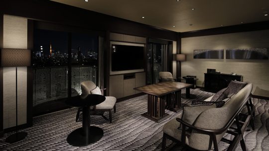 バルコニー付き最上階に位置する、日本庭園との調和を意識したラグジュアリーな空間を演出した、120㎡のスイートルーム。