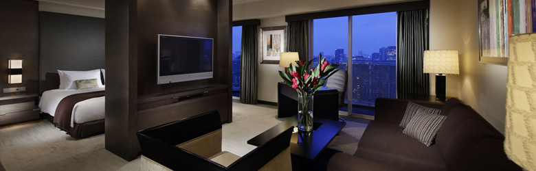 バルコニー付き2室分のスペースを使用した、開放感あふれるワンルームタイプのスイート。