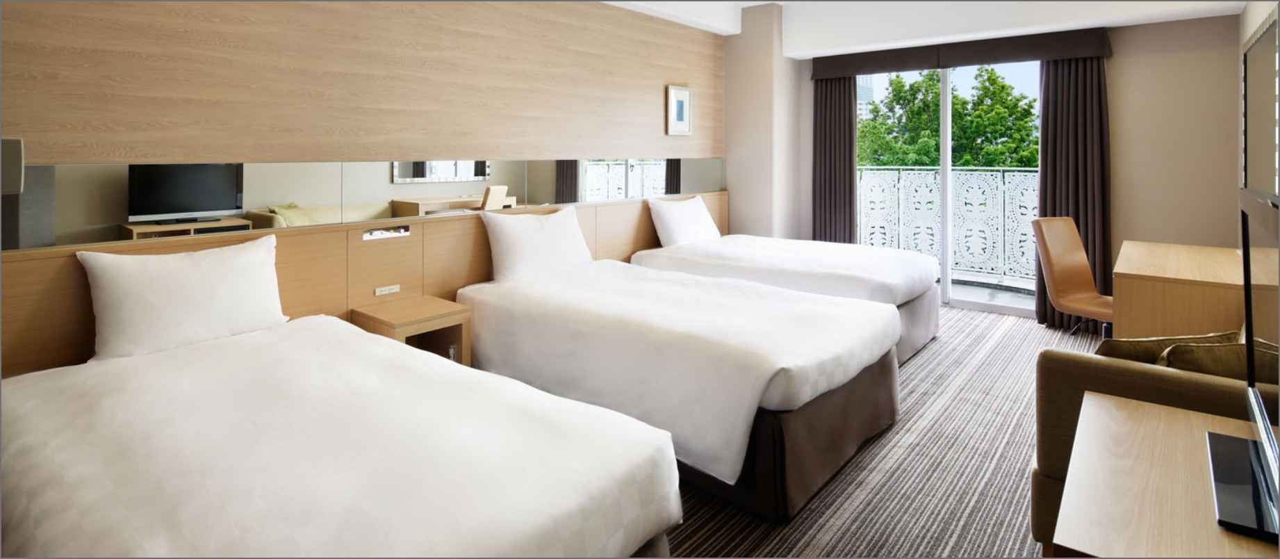 3名さまでご利用できるお部屋で、ご家族や女子会などグループでの滞在におすすめです。客室全体は木目調の自然を意識したデザインに統一しております。
