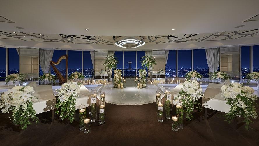 新横浜エリア一の高さを誇る、地上150m42F建ての高層ホテル「新横浜プリンスホテル」では、客室やレストラン・バー、宴会場、チャペルからも美しい夜景をご覧いただけます。煌びやかな夜景を見ながら、至福のひとときをお過ごしください。