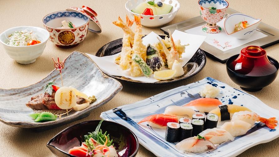 「天婦羅盛り合わせ」「握り寿司盛り合わせ」「黒毛和牛網焼き」からお選びいただける主菜とフリードリンクが付いた歓送迎会におすすめな和食プラン。