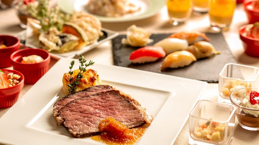 季節ごとのフェアメニューや、国産牛のオーブン焼き、握り寿司、パルミジャーノで仕上げるリゾットなど、フリーフローのドリンクをお楽しみいただけるブッフェプランを販売しております。
