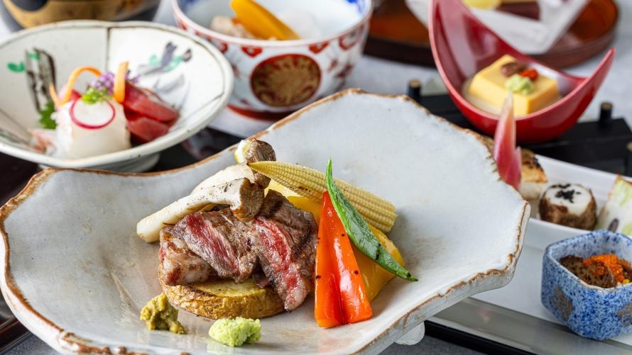 黒毛和牛網焼きを主菜とした会席とフリードリンクがセットになったプラン。