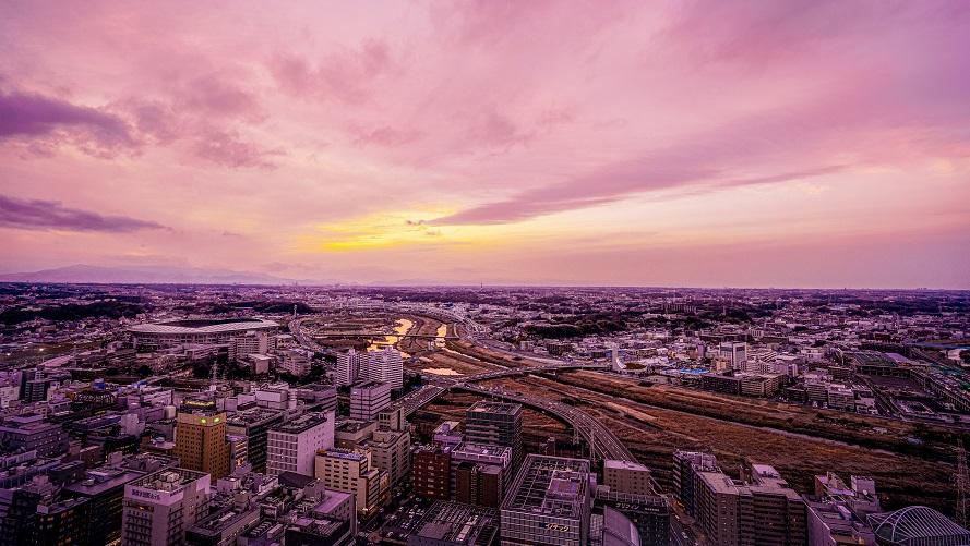 晴れた空と雲、新横浜の街並みをイメージ。
