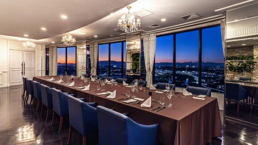 緑鮮やかな植栽に囲まれ、水のせせらぎが感じられる、落ち着いた雰囲気の地上約140mの個室「スカイガーデン」にてシェフによるカッティングサービスでご提供するローストビーフをメインとしたコース料理をお楽しみいただけます。