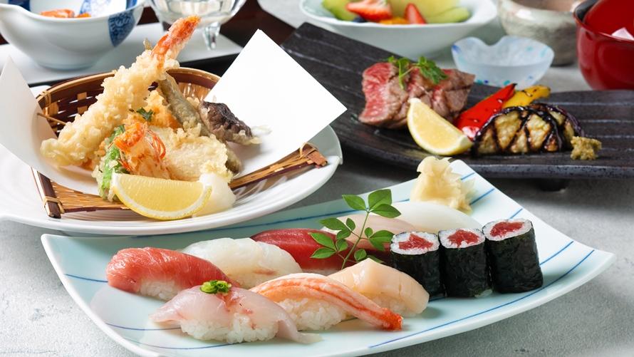 天婦羅や黒毛和牛網焼き、握り寿司などを一度にご堪能いただけます。